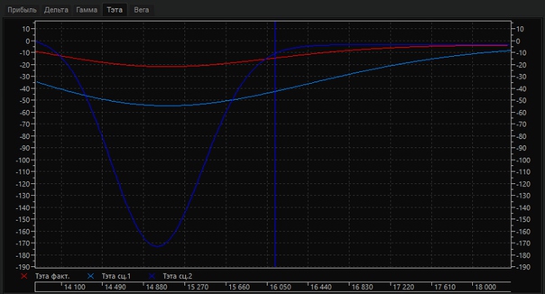 Besides the delta, the long spread still has one crucial risk – it is Teta, time disintegration of the option. As all my options bought, time works for me, and every day they lose the temporary cost. Considering what in approach to the expiration of the tet amplifies, now its profile looks as follows: