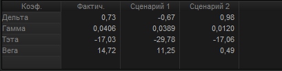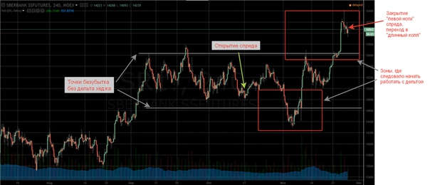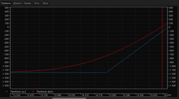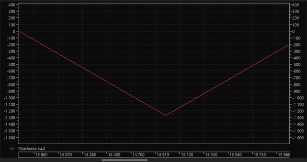 По горизонтали отложены цены базового актива. Тут видно, что пока фьючерс находится в диапазоне стоимость опионов перекрывает прирост их доходности, иными словами позиция оценивается ниже нуля. Для того, чтобы доходность перекрыла премию по опционам, базовый актив должен либо продолжить рост, либо начать падать.
